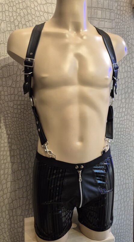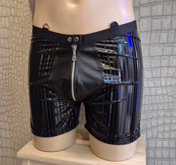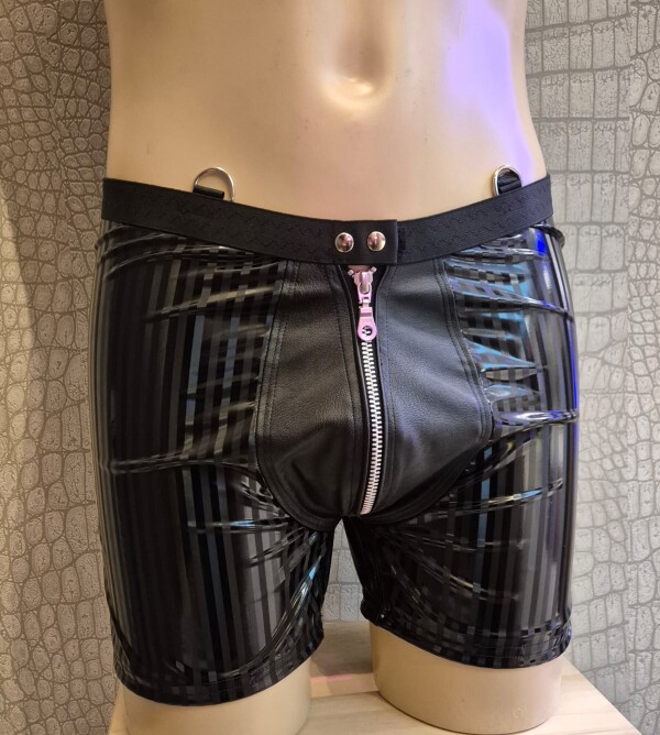 Zwarte lakshort met subtiele verticale streep en een mooi afgewerkte pouch van kunstleer aan de voorkant. Prachtig met het bijbehorende shirt, maar zeker ook met een stoer harnas!