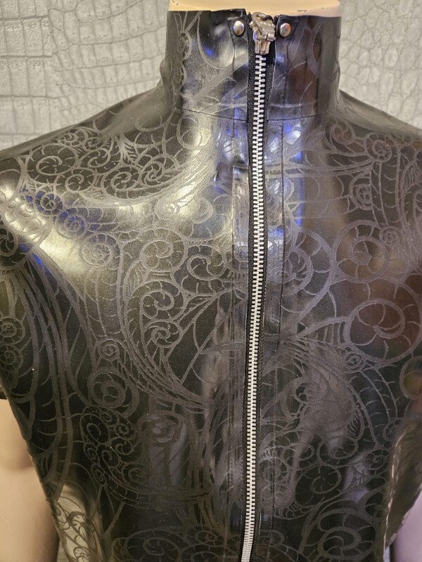Latex shirt met korte mouwen en een klein opstaand kraagje. Sluit met een kunststof rits aan de voorkant. Deze stoer top is gemaakt van zwarte latex met aan de voorkant en op de mouwen een paisley print.