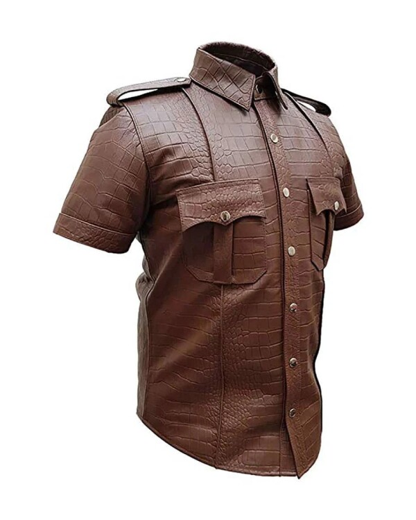 Fantastisch mooi politie shirt in bruin leer met 3-D crocoprint. Dit fraaie overhemd heeft korte mouwen met epauletten op de schouders. Aan de voorzijde een drukker-sluiting in zilverkleur.