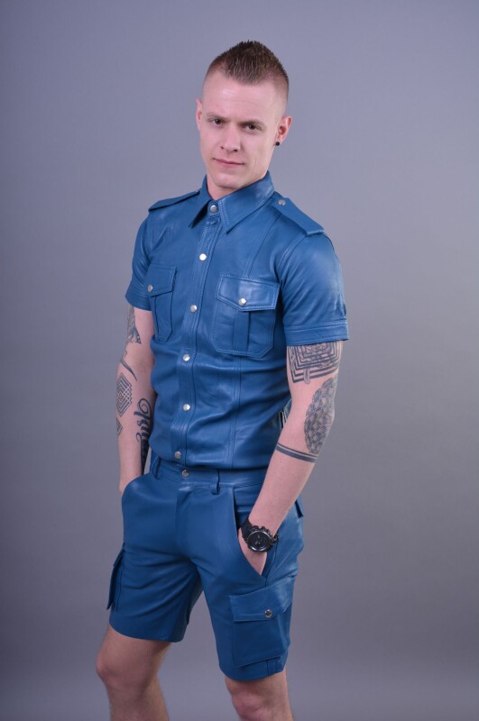 Dit Leren getailleerde overhemd heeft korte mouwen, zwarte knopen, epauletten en twee borstzakken. Dit overhemd is iets langer (3 cm) dan andere klassieke overhemden.