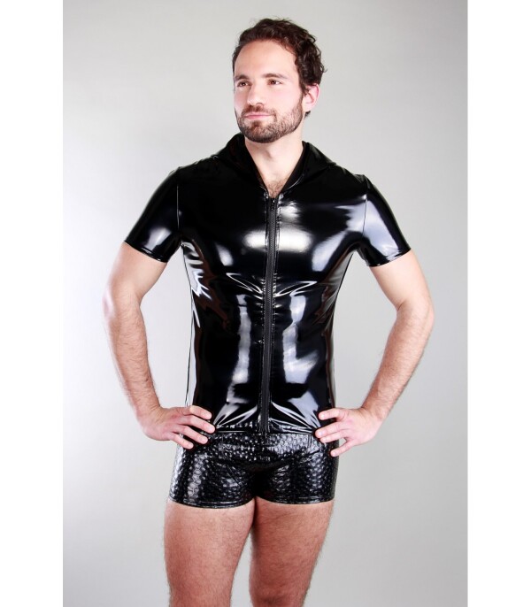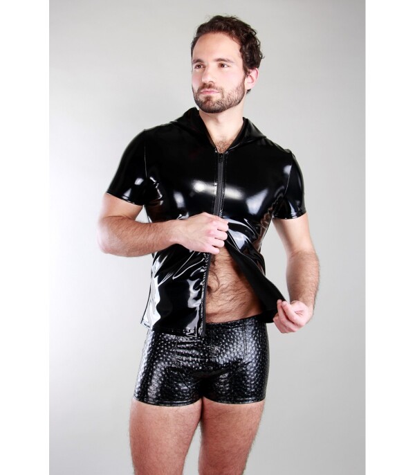 Nauw aansluitende lak top met korte mouw en capuchon. Deze top is gemaakt van elastische zwarte lak en heeft een bijzondere rits.