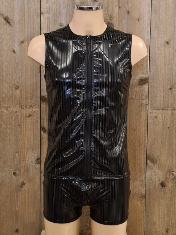 Mooie mouwloze top met rits, gemaakt van hoogglanzende zwarte lak met een antraciet kleurig streepje.