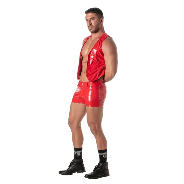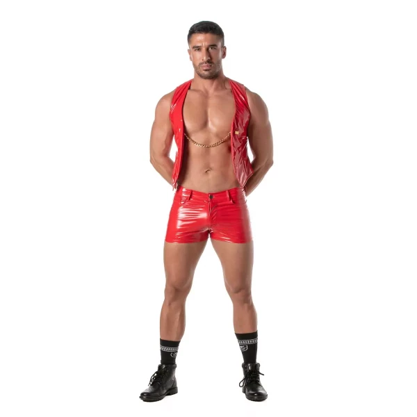 Sexy gilet gemaakt van hoogglanzende rode lak. Het sluit met een , afneembare, goudkleurige metalen ketting.