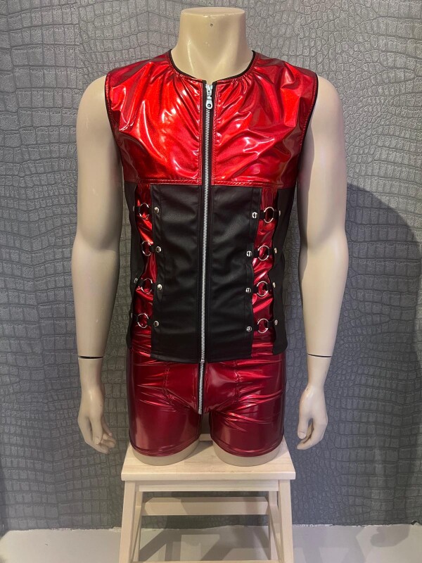 Stoere mouwloze top gemaakt van hoogglanzend metallic rood materiaal afgewerkt met zwart kunstleer en metalen ringen. Deze mooie top sluit met een zilverkleurige metalen rits aan de voorkant. Leuke set i.c.m. het bijpassende broekje.