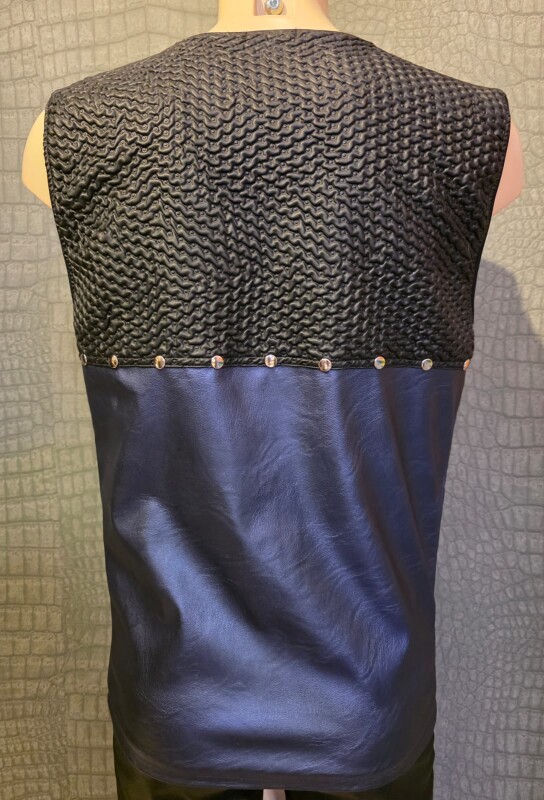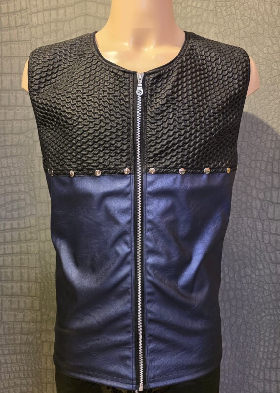 Stoere mouwloze top gemaakt van blauw en zwart kunstleer. De onderste helft is glad blauw, de bovenste helft is zwart met een 3-D relief golvend patroon. Deze fraaie top sluit met een zilverkleurige metalen rits aan de voorkant.